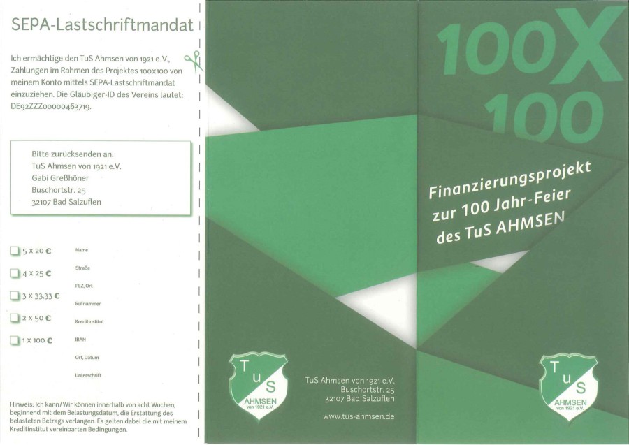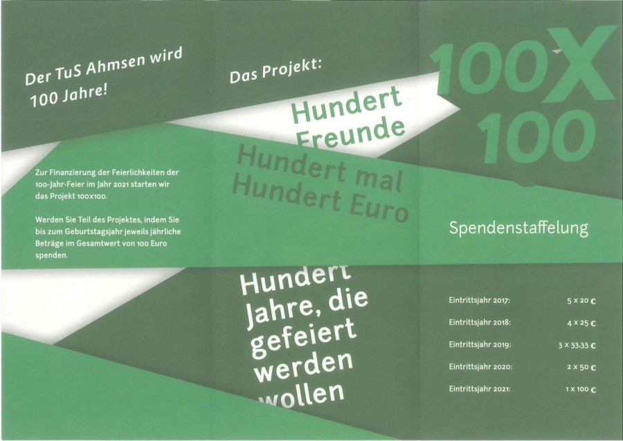Hierzu haben wir das Projekt „100x100“ ins Leben gerufen. Jedem, dem der Verein am Herzen liegt, soll die Möglichkeit gegeben werden, mit einem Betrag von insgesamt 100,00 € bis zum Geburtstagsjahr einen finanziellen Beitrag zum Jubiläumsfest zu leisten. Je früher die Teilnahme, desto geringer der jährliche Beitrag. Im beiliegenden Flyer sind die wichtigsten Eckdaten zu diesem Projekt zusammengefasst.